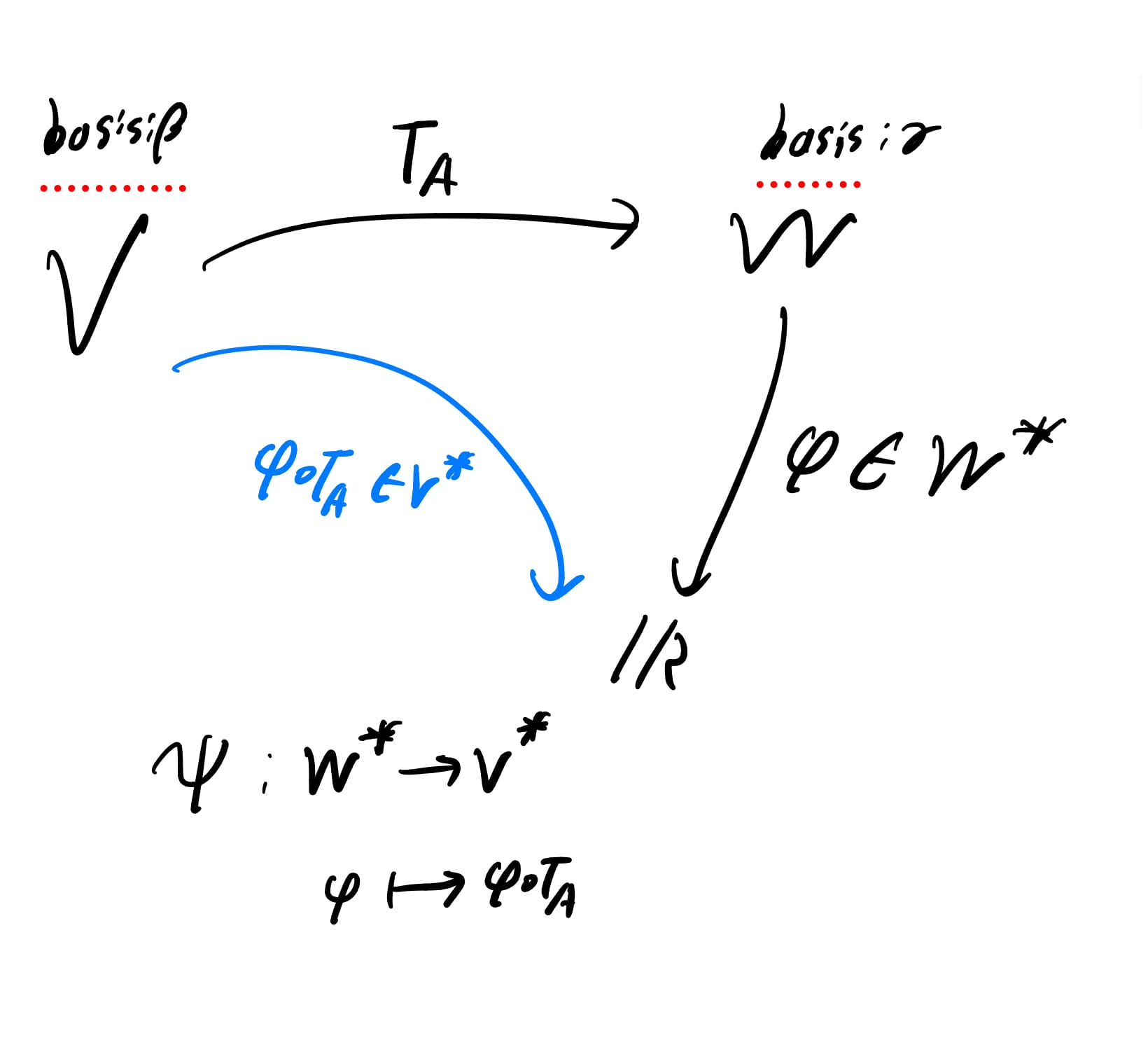 $W^*$의 벡터 $\phi$에 대해 $T_A$와 $\phi$의 합성변환 $\phi \cdot T_A$는 $V$에서 $\mathbb{R}$로 가는 선형변환이기에, $V^*$의 벡터가 된다. 따라서 $psi(\phi) = \phi \cdot T_A$로 정의할 때, $\psi : V^* \rightarrow W^*$가 잘 정의된다.