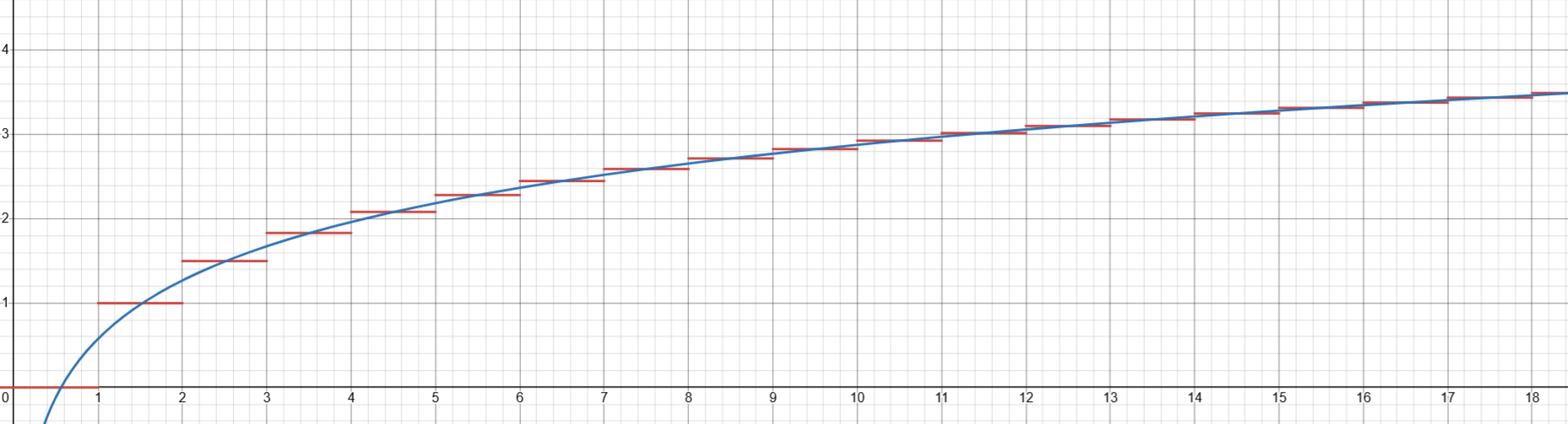 따라서 원래의 조화급수는 다음과 같이 적분으로 근사하던 것을
