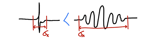 그럼 두 물질파의 위치 $x$와 파장 $\lambda$를 고려해보자. 아래 그림처럼 왼쪽 물질파는 오른쪽 물질파보다 비교적 더 좁고, 따라서 물질파의 존재하는 위치의 범위, 즉 위치 불확정성 $\sigma _{x}$는 왼쪽 물질파가 더 작다고 볼 수 있다.