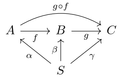 이번에는 $\mathcal{C}$의 object $S$를 이용해서 정의하는 범주를 알아보자. 유사한 범주 두 종류가 있는데 먼저 $(\mathcal{C}\downarrow S)$를 보면, object는 $\mathrm{cod}(\alpha)=S$인 $\mathcal{C}$의 arrow이고, 두 object $\alpha:A\to S,\beta:B\to S$ 사이의 arrow는 $\beta\circ f=\alpha$인 $\mathcal{C}$의 arrow $f:A\to B$로 정의된다. 자연스럽게, arrow $f:\alpha\to\beta,g:\beta\to\gamma$의 composition은 $\mathcal{C}$에서의 composition $g\circ f$이고, object $\alpha:A\to S$의 identity arrow는 $\mathcal{C}$에서 $A$의 identity arrow와 같다. 반대로2, $(S\downarrow\mathcal{C})$도 정의할 수 있다. $(\mathcal{C}\downarrow S)$에서 화살표의 위아래 방향을 뒤집으면 된다.(이해가 안된다면, 아래 그림을 보자.)