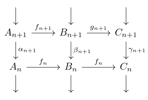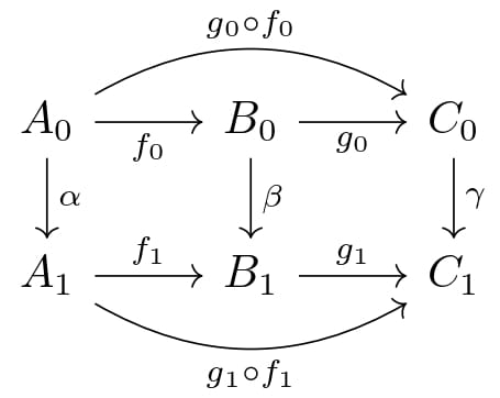 이제, module homomorphism을 arrow로 하면, 어떤 환 $R$ 위의 left module의 범주 $\mathbf{R-Mod}$을 정의할 수 있다. 이제, $\mathbf{Ch(R-Mod)}$라는 범주를 알아보자. 먼저, object는 몇 가지 조건을 만족하는, $\mathbb{Z}$에서 정의된 두 함수 $A_\bullet:\mathbb{Z}\to Obj(\mathbf{R-Mod}),d_\bullet:\mathbb{Z}\to Arw(\mathbf{R-Mod})$이다. 이 때, $A_n:=A_\bullet (n), d_n:=d_\bullet (n)$으로 쓰며, $d_n$의 source와 target이 각각 $A_n,A_{n-1}$와 $d_n\circ d_{n+1}=0\forall n\in\mathbb{Z}$를 만족해야 한다. 이제 arrow를 정의해보자. $\mathbf{Ch(R-Mod)}$의 arrow $f_\bullet:(A_\bullet,\alpha_bullet)\to(B_\bullet,\beta_\bullet)$은 함수 $f_\bullet:\mathbb{Z}\to Arw(\mathbf{R-Mod})$로 정의되는데, 이때 $f_n$은 source와 target이 각각 $A_n,B_n$이고, $f_n\circ \alpha_{n+1}=\beta_{n+1}\circ f_{n+1}\forall n\in\mathbb{Z}$를 만족해야 한다. 자연스럽게, $f_\bullet$과 $g_\bullet$의 composition은 $(g\circ f)_n=g_n\circ f_n$으로 정의하고, $(A_\bullet,d_\bullet)$의 identity arrow는 $f_n=id_{A_n}$으로 정의할 수 있다.