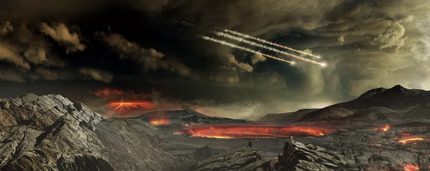 자, 그럼 다시 창문 밖으로 시선을 옮겨 봅시다. 저희가 보고 있는 이 광경은 명왕누대 중에서도 지구 탄생 후 2000만년 정도가 흐른 뒤랍니다(약 45억 4000만 년 전). 생각보다 그렇게 격렬하진 않죠? 사실 이 시기는 이미 지구가 형성되고 충분한 시간이 흐른 뒤라서 격렬한 운석 충돌 같은 건 없답니다. 이미 그런 시기는 더욱 초기에 벌어졌거든요. 그렇다면 지금부터 이 초기 이야기를 함께 해 볼까요?