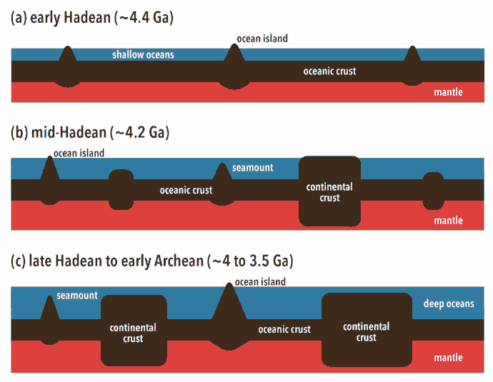 물론 우리에게 익숙한 지구라 하면 지구 내부 구조만 있는 건 아닐 겁니다. 예를 들어 지구의 트레이드 마크라고 할 수 있을 만한 푸르른 바다와 대륙들이 있겠죠. 마찬가지로 이 시대엔 이미 넓은 바다가 있었습니다. 더 정확히는 우리가 지금 땅에 있어서 잘 보이지는 않지만 이 시기 지구의 대부분은 물로 덮여있었지요. 수면 위로 드러나 있는 땅은 극히 일부분에 불과했습니다. 그리고 우리에게 익숙한 크기의 땅들과 대륙은 시생대와 원생대에 가서야 비로소 갖춰지죠.