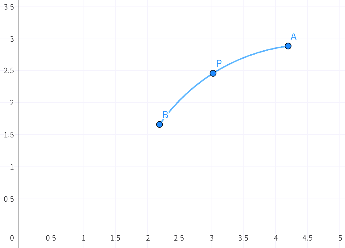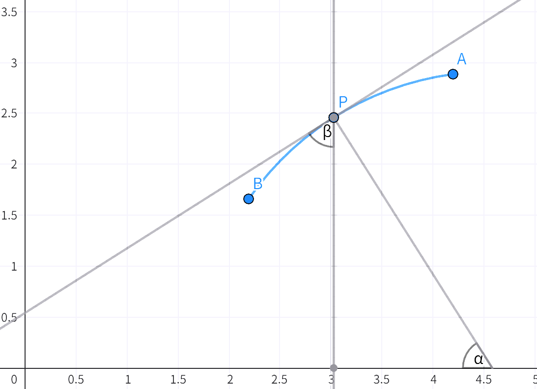 시작점 $(x_1, y_1)$을 점 A, 도착점 $(x_2, y_2)$를 점 B라 하자. A에서 B에 도달하는 최단 시간 경로는 앞선 논의에 의해 스넬의 법칙을 만족함을 알 수 있다. 이 최단 경로 곡선을 $\gamma$라 하자. 2차원 좌표평면에 해당 경로를 표현하자.