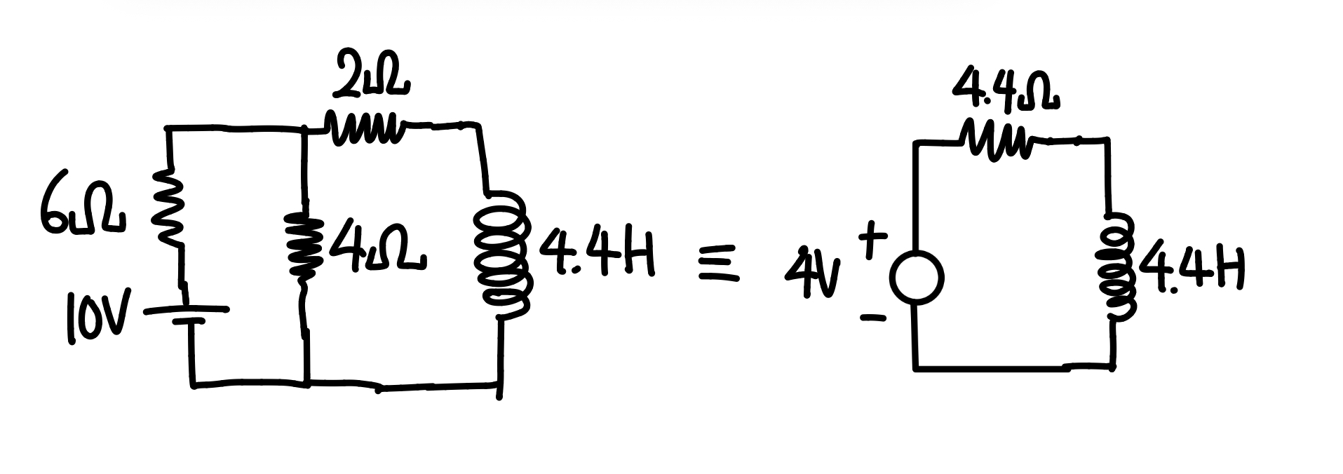 딱 문제를 마주했을 때는 저항과 인덕터가 복잡하게 연결되어 있어서 전류를 어떻게 잡야아 할 지 감이 안 온다. 이 때, 테브난 정리를 활용하여 인덕터 이외의 부분을 모두 다음과 같이 테브난 등가회로로 변환할 수 있다.
