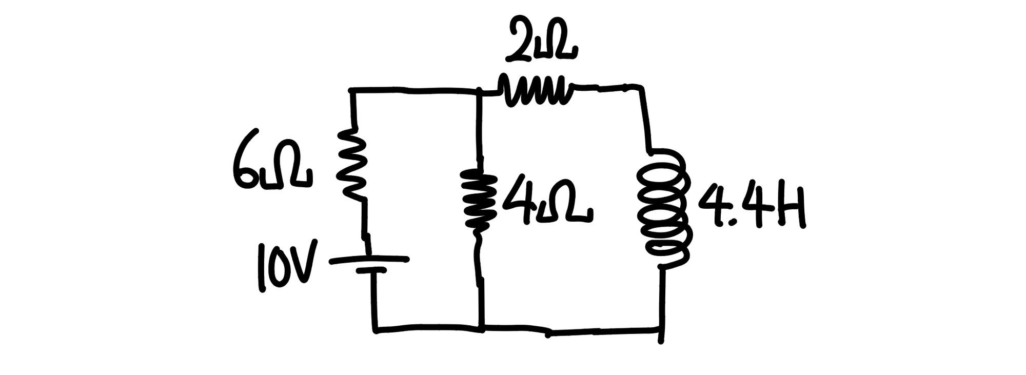 다음 회로에서 스위치를 닫은 후 지난 시간을 t라고 했을 때, 인덕터에 흐르는 전류를 t에 관해 표현해보자.