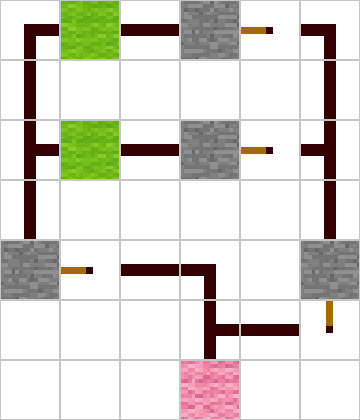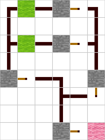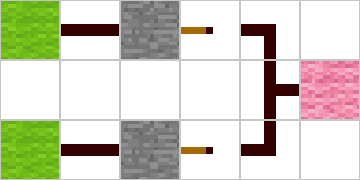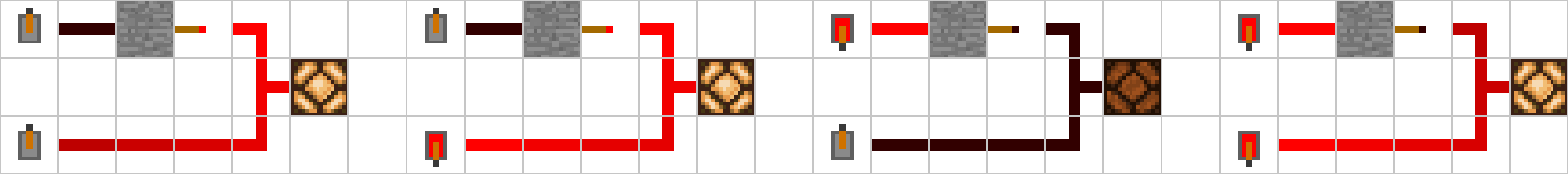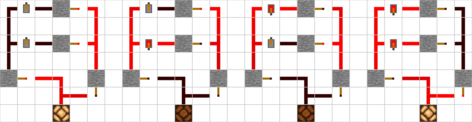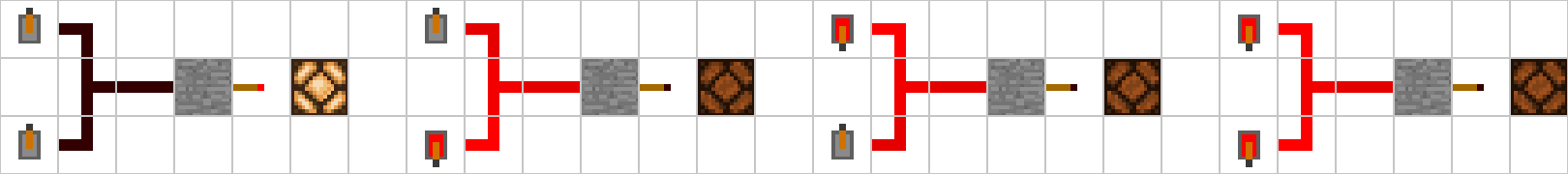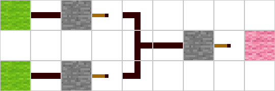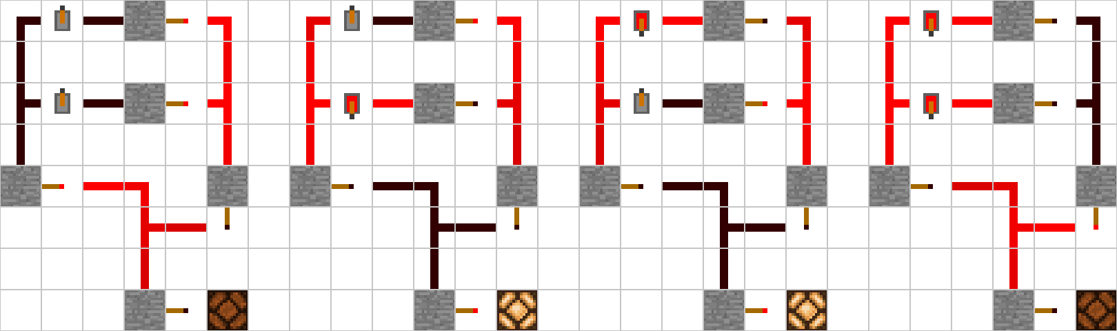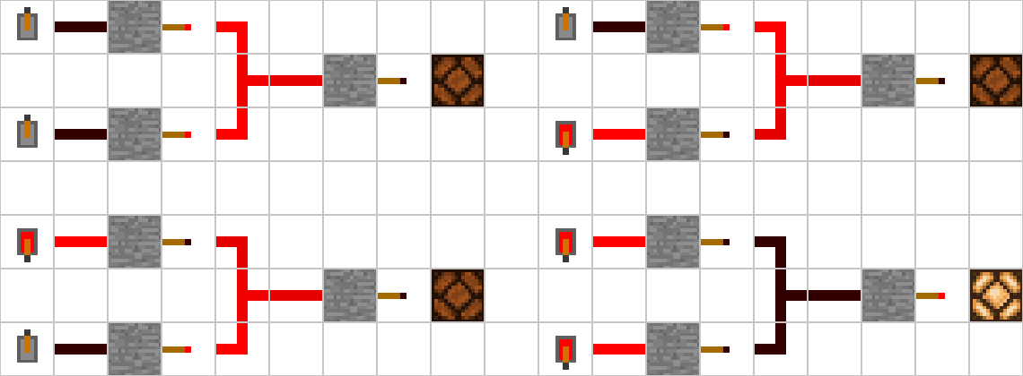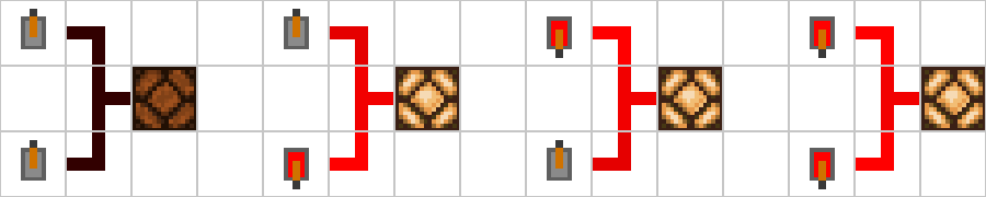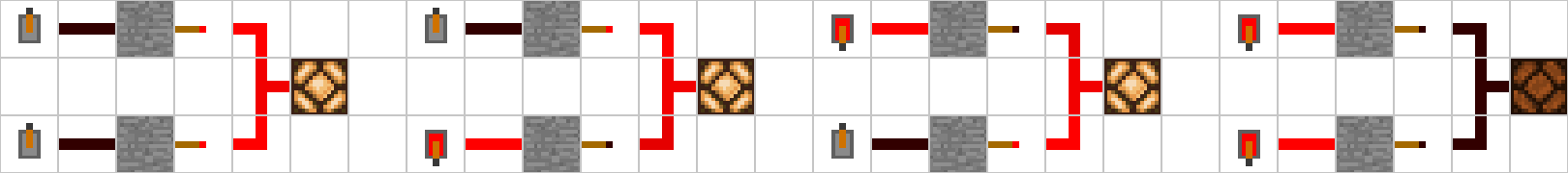 여기에 등장하는 모든 개략도는 필자가 만든 프로그램에서 직접 캡처한 것이기 때문에 마인크래프트의 텍스처와 살짝 다를 수 있다. 또한, 여기에 등장하는 모든 개략도는 가장 효율적인 방법이 아니다. 최대한 직관적으로 만들다 보니 효율을 포기할 수 밖에 없었다. 가장 효율적인 방법이 궁금하다면 마인크래프트 위키를 참고하면 된다.